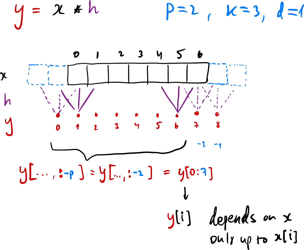 This approach maintains the input’s spatial extent (which is now the sequence length), while also ensuring that each output element was only computed from elements which are no later in time. To see why this works, see the figure below (sorry for hand-drawing…).