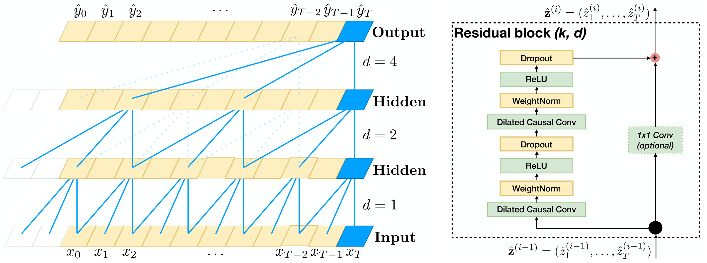 - 1D convolutions with padding and output slicing to ensure causality and a consistent output sequence size.